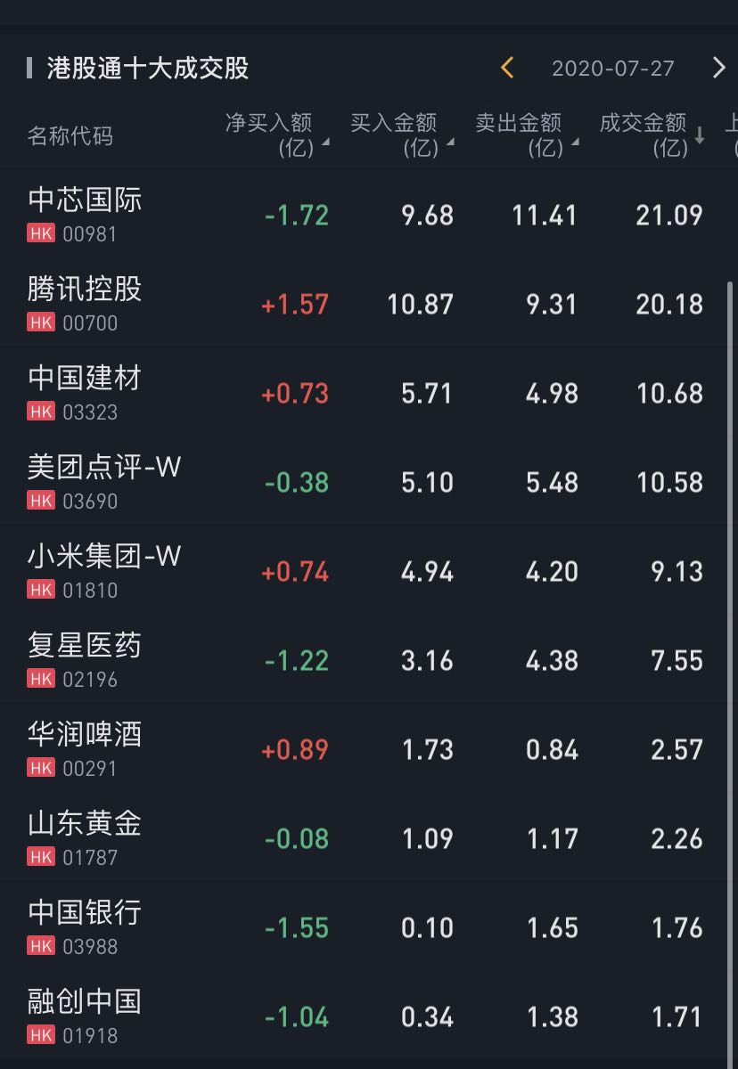 个股方面,今日南下资金净买入中国建材0.73亿港元,腾讯控股1.57亿港元。南向资金今日净卖出中芯国际1.72亿港元,净卖出复星医药1.22亿港元。