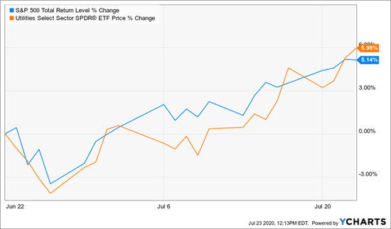 他说,此外,具有避险功能的公用事业板块的表现可能预示着整个市场将出现麻烦,他指出,这张图表显示了过去一个月防御性投资如何跑赢标普500指数。