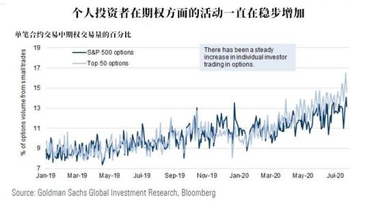 此外,高盛估计,过去一年中,标普500指数成分股的个人投资者活动翻了一番。在标普500指数股票期权方面,个人投资者活动在过去一年里上升了40%。