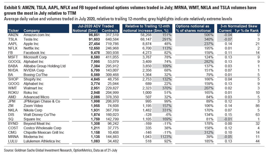 许多大型公司期权交易量的增加极大地推动了这股期权交易激增的浪潮。7月份,亚马逊(AMZN)、特斯拉(TSLA)、苹果(AAPL)、奈飞(NFLX)和Facebook(FB)的股票期权交易量最高。与前12个月相比,在名义交易量最高的25家公司中,MRNA、沃尔玛(WMT)、尼古拉(NKLA)、TSLA的涨幅最大。
