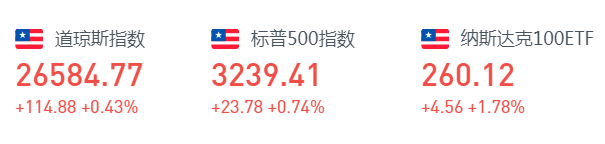 道指周一低开高走,盘初升逾百点,盘中走势平稳,尾市升幅先收窄后继续扩大。截至收盘,道指涨0.43%,报26584.77点;标普500指数涨0.74%,报3239.41点;纳指涨1.67%,报10536.27点。