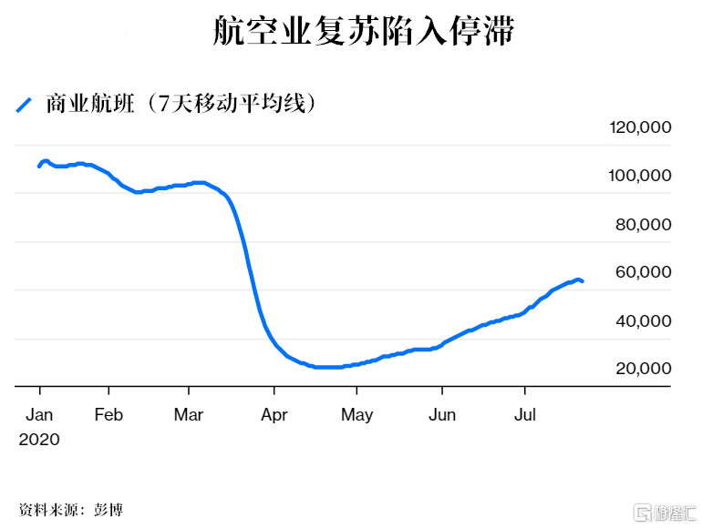 航空业的复苏也陷入了停滞。Flightradar24的数据显示,商业航班的数量已经稳定在今年初的50%多一点的水平。