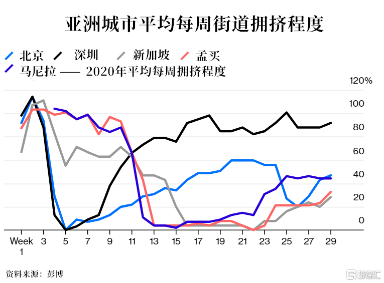 投资者普遍认为,亚洲的经济复苏要比世界其他地区强劲得多,至少亚洲交通拥堵的加剧程度参差不齐。像下图中的深圳,街道非常繁忙。但在北京、新加坡、孟买和马尼拉,交通拥堵程度仍只有疫情前的40%左右,这表明道路上的车辆要少得多。