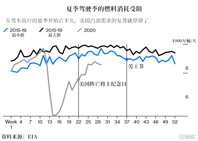 美国的燃料消耗量增长也受阻了。夏季原本是一个重要的驾驶季节,但在阵亡将士纪念日假期(5月25日)过后不久,汽油需求的复苏就停滞了。现在,佛罗里达和加利福尼亚等度假州的新冠病例激增,每日感染人数不断刷新记录,死亡人数持续上升。这限制了美国人民的旅行计划,打击了对汽油和航空燃料的需求。