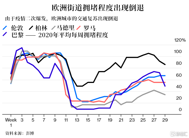 在欧洲城市,交通拥堵程度已经趋于稳定,甚至在封锁解除后,交通拥堵有所上升,不过之后又有所下降。这在一定程度上反映出人们可能出去度假了,因为法国南部的尼斯等沿海城市的拥堵程度依然较高。