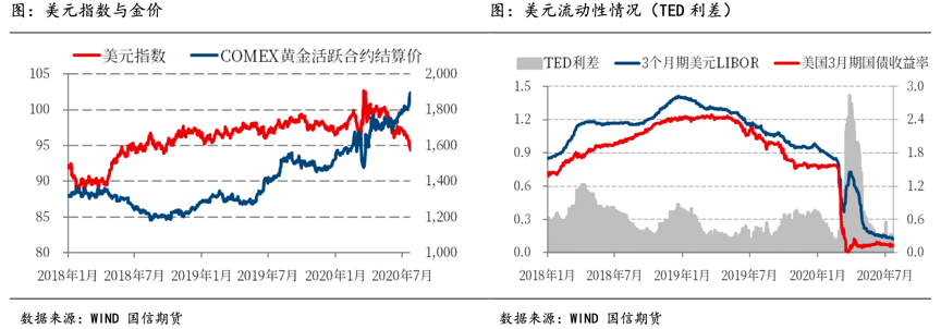 在欧美宽松放水力度不减,美国经济表现弱势,且财政赤字高企的多重因素下,美元指数连 续五周走弱。2020年7月美元指数自97下跌至94附近,创近两年来新低。