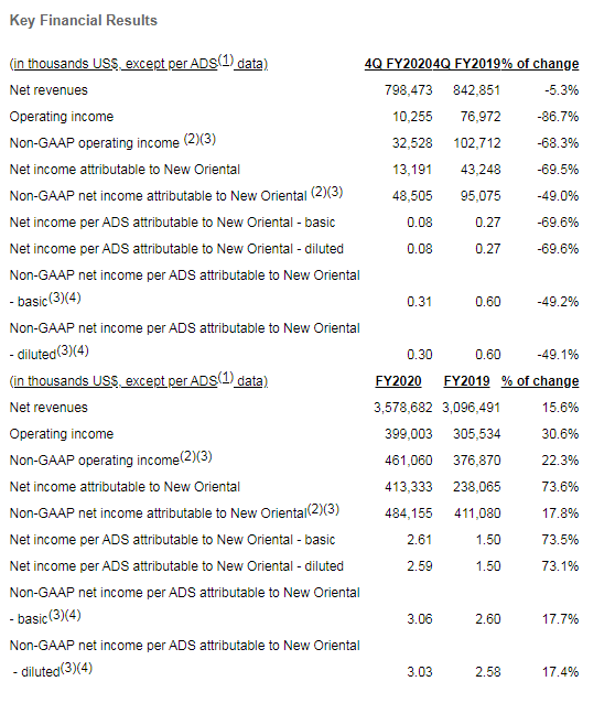 新东方今日公布了2020财年全年及第4季度财务业绩。