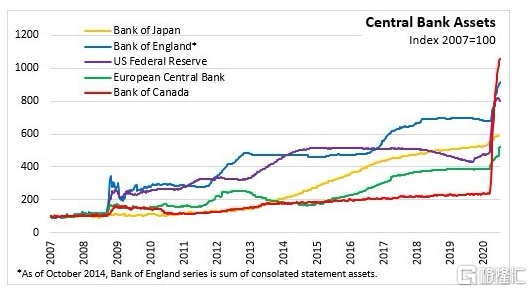 这背后主要是因为疫情爆发以来,美联储推出了大规模的刺激兜底措施,资产负债表从4万亿飙升至7万亿美元,且美联储承诺相当长一段时间内都不会加息,也让市场对于通胀前景更加乐观。真实利率上一轮超级下行周期发生在2009年到2012年,也正好是金融危机后美联储施行量化宽松所推动。