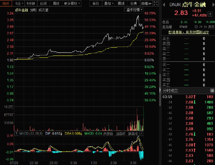 北京时间7月29日消息,隔夜美股全线走低,道指跌超200点,中概股方面,点牛金融领涨,截至收盘,点牛金融涨47.40%,报2.83美元。