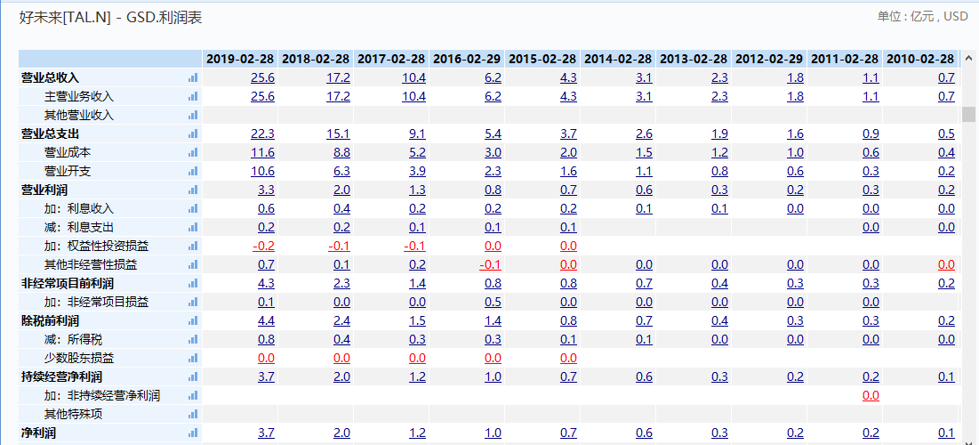 10年涨幅接近40倍的好未来,靠的不是泡沫,而是坚实的业绩增长。2010年,好未来每年营业收入0.7亿美元,净利润0.1亿,2019年的好未来已经变成了另一个模样,营收25.6亿美元,净利3.7亿。营收方面,10年-19年,好未来翻了69.5倍,净利润方面,好未来翻了37倍。这样一看,10年40倍涨幅就有了合理的解释。