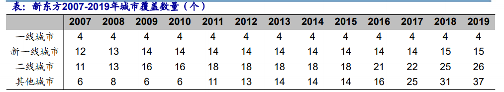 根据新东方2019财年年报,2019年,新东方除北京、扬州、长春、苏州、青岛和南京外,其他城市都只有一所学校,其中北京有6所。一线及新一线城市:在07年就已经基本完成布局,因此学校数量在07-19区间分别增长3个,6个学校。二线及其他城市:在07-11年区间稳定增长。其中二线城市09年增速达到峰值38.46%,其他城市在11年增速达到峰值83.33%。12-15年区间,新开设学校进度缓慢,二线城市和其他城市分别新增1个,3个。16-19区间重新开始快速扩张。