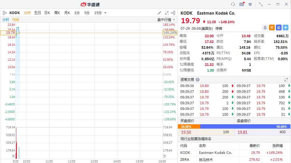 柯达今日开盘继续大涨,现涨149.24%触及熔断,柯达昨日收涨205.73%。