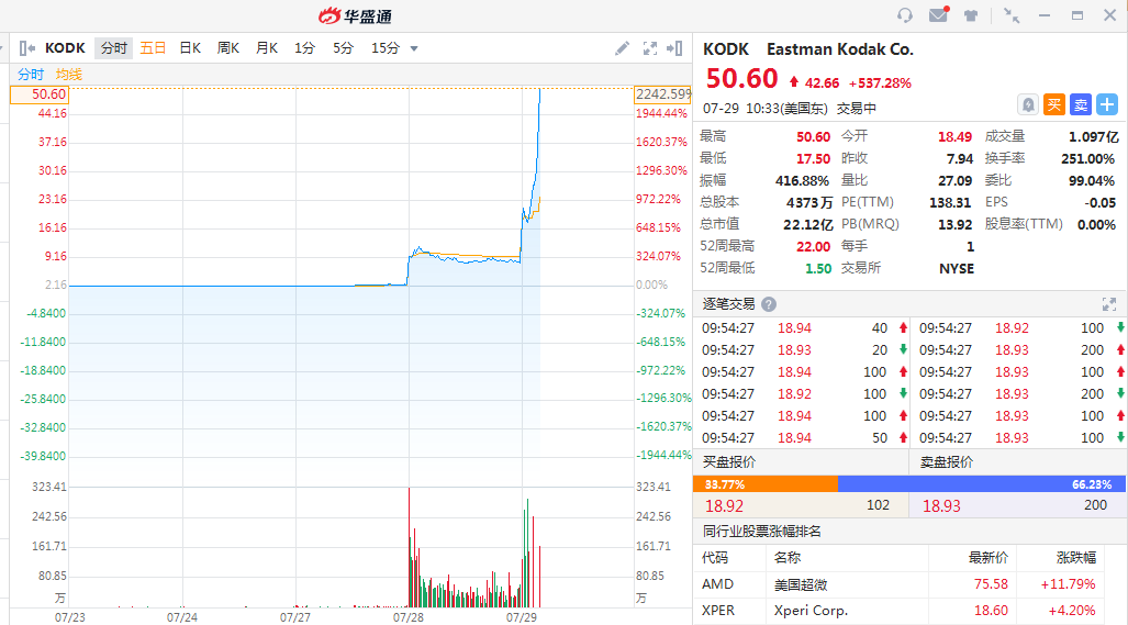 柯达今日股价继续暴涨,现涨537.28%第九次触发熔断,总市值超22亿美元,两日涨超2240%。