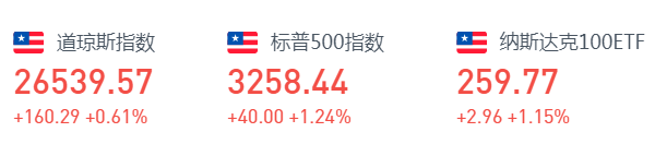 截至收盘,道指涨0.61%,报26539.57点;纳指涨1.35%,报10542.94点;标普500指数涨40.00点或1.24%,报3258.44点。