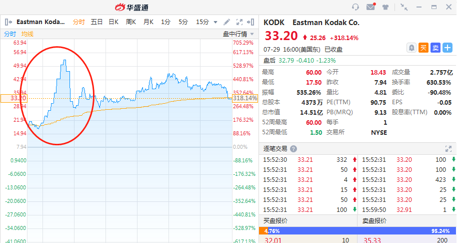 柯达收盘暴涨318.14%,盘中十余次触及熔断
