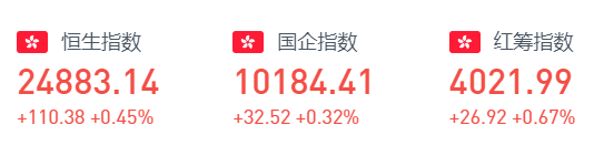 恒生指数周三开盘跌0.25%,全天呈震荡上扬走势。截至收盘,恒生指数涨110.38点或0.45%,报24883.14点,全日成交额达1044.48亿。国企指数涨0.32%,报10184.41点,红筹指数涨0.67%,报4021.99点。