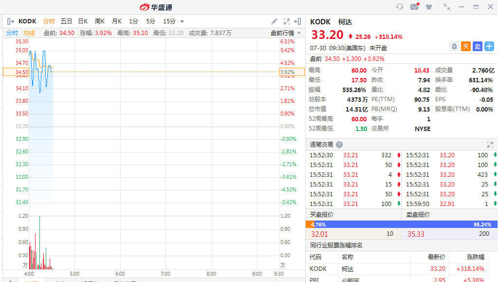 智通财经APP获悉,7月30日(周四)美股盘前,柯达(KODK.US)股价小幅上扬,截至16:30,该股涨3.92%。