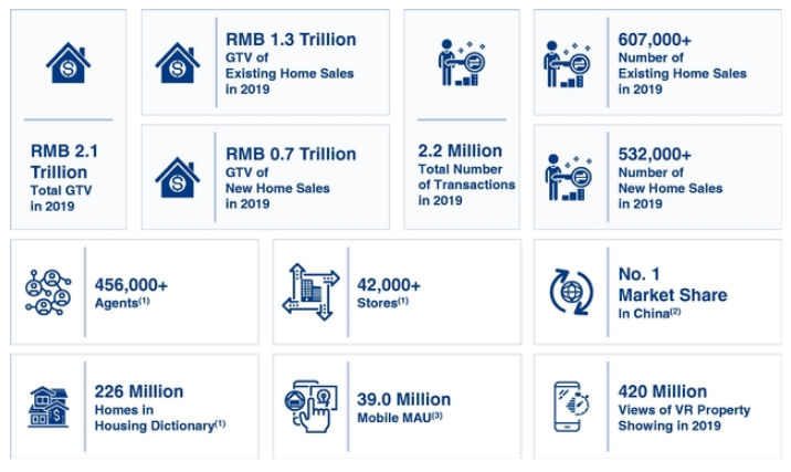 截至2019年,贝壳的总平台交易金额(GTV)达到了人民币21280亿元(约3005亿美元),平台上促成超过220万笔交易,这也使贝壳成为中国最大的房地产交易和服务平台。