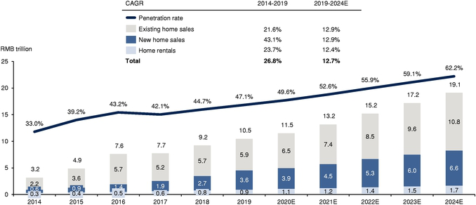从2014年到2019年,中国居住经纪服务在所有房屋交易中的渗透率,包括二手房、新房销售和房产相关市场,按GTV计算,经纪服务的渗透率从33.0%增加到47.1%,并将在2024年进一步增长到62.2%。