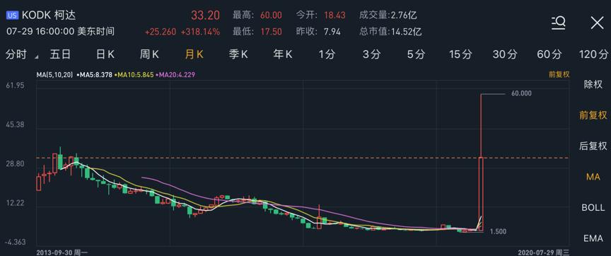 巨额贷款+抗疫概念+特朗普加持+小市值,正是这一系列因素促使柯达股票短期出现了非常惊人的涨幅。
