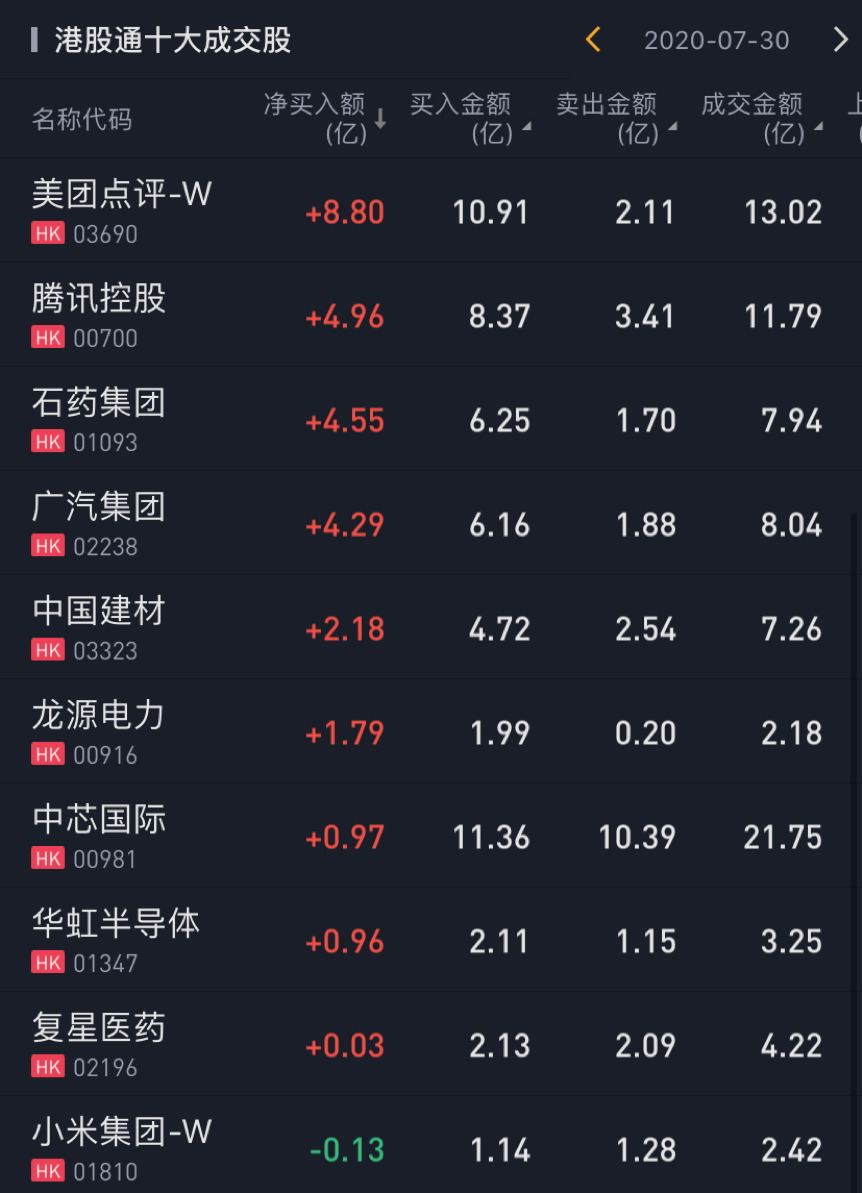 个股方面,今日南下资金净买入美团点评8.80亿港元,净买入腾讯控股4.96亿港元,净买入石药集团4.55亿港元,净买入广汽集团4.29亿港元,净买入中国建材2.18亿港元。