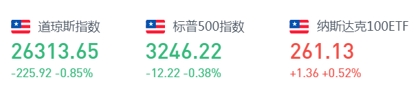 周四美国三大股指涨跌不一,截至收盘,道指跌0.85%,报26313.65点;纳指涨0.43%,报10587.81点;标普500指数跌0.38%,报3246.22点。