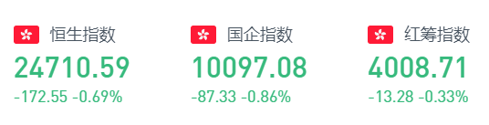 恒指周四盘中冲高回落,午后跌幅扩大,一度挫逾250点。截至收盘,恒生指数跌172.55点或0.69%,报24710.59点,全日成交额达1283.71亿。国企指数跌0.86%,报10097.08点,红筹指数跌0.33%,报4008.71点。