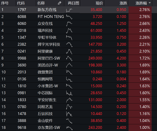 恒生科技股集体走高,新东方在线、鸿腾、众安在线、瑞声科技、华虹半导体、舜宇、阿里健康等集体涨超2%,阿里巴巴、小米、美团、京东集体涨超1%。