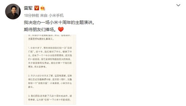 7月31日,小米科技创办人、CEO雷军发文宣布,“决定办一场小米十周年的主题演讲”。