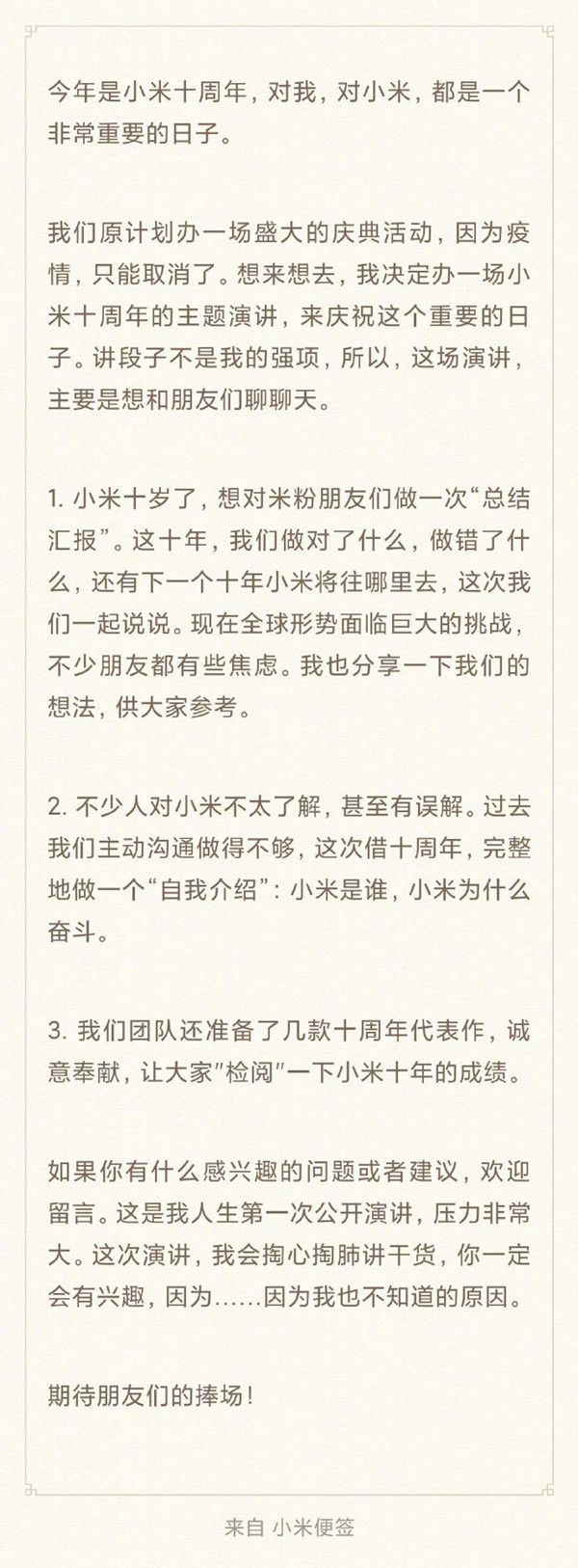 雷军发文称,“今年是小米十周年,对我,对小米,都是一个非常重要的日子。我们原计划办一场盛大的庆典活动,因为疫情,只能取消了。想来想去,我决定办一场小米十周年的主题演讲,来庆祝这个重要的日子。”