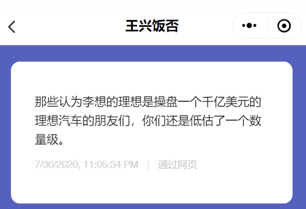 但美团创始人同时也是理想汽车的重要投资人王兴,在昨晚却说了一句:那些认为李想的理想是操盘一个千亿美元的理想汽车的朋友们,你们还是低估了一个数量级。 这意思应该就是说,王兴认为李想未来能够操盘一个市值万亿美元的公司。