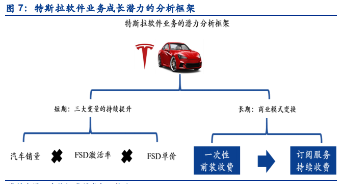 站在马斯克的视角,卖车只是开始,软件服务收费才是其未来最核心的商业模式。对于特斯拉软件业务的商业潜力的评估,可以从短期和中长期两个维度考虑。1)短期:在不改变前装一次性收费的商业模式的前提下,特斯拉软件业务主要由汽车销量、激活率、单价三大变量驱动。2)中长期:马斯克正在积极推动 FSD 从一次性前装收费的模式转变成订阅服务持续收费的模式。根据科技媒体 electrek 报道,特斯拉有望在年底前推出 FSD 订阅服务,价格约为每月 100 美元。一旦完成软件订阅服务的商业模式转换,每辆激活 FSD 的销售车辆都有望为特斯拉贡献持续的现金流。