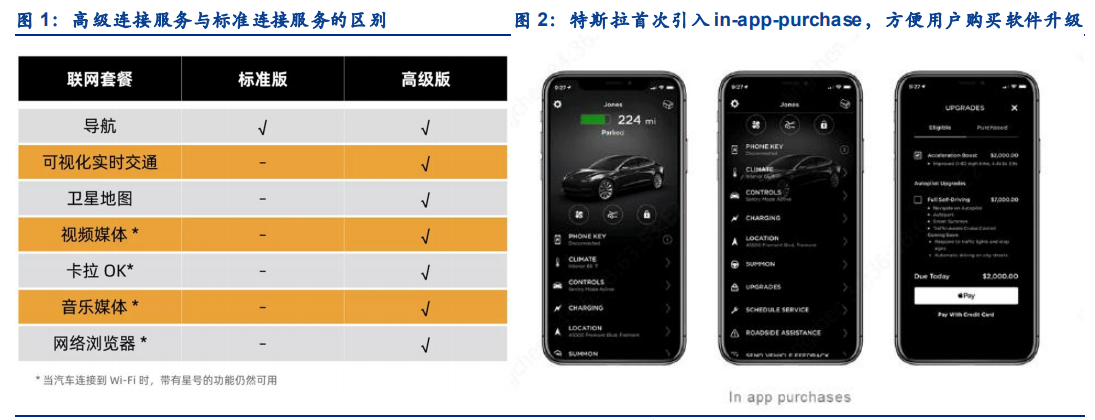 通过持续升级,特斯拉的软件和应用服务生态越来越像苹果。1)首次引入了软件应用商店,方便用户购买软件升级。未来所有特斯拉车主都可以在特斯拉的 APP 中购买各种软件更新服务,例如基本版自动辅助驾驶,完全自动驾驶,加速性能提升以及其他高端功能;2)首度开启高级连接服务收费(9.9 美元/月)。只有车主支付了服务费才能用实时路况、卡拉 OK、流媒体等功能。