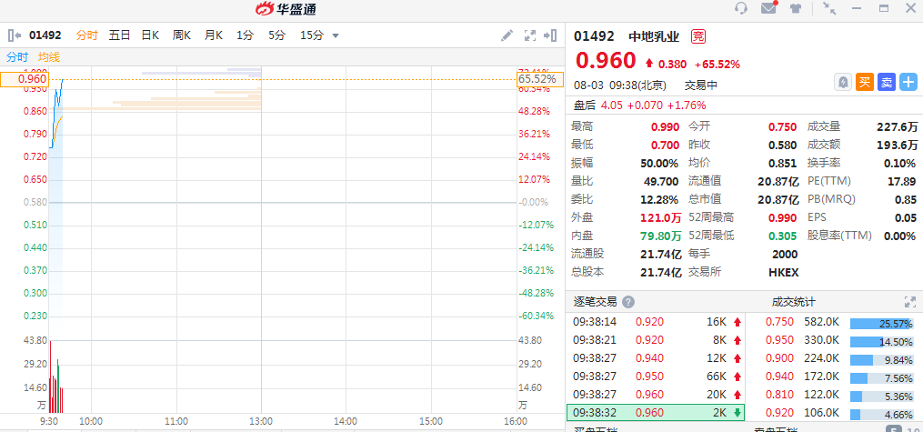 新浪港股讯 8月3日消息,中地乳业拟引入伊利为主要股东,股价大涨65.52%,报0.96港元。