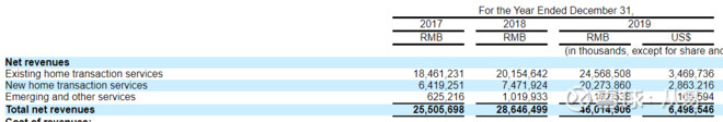 招股书显示,贝壳在2017-2019年在二手房板块的收入分别为人民币185亿、202亿、246亿元,同比分别增长9%、22%;在新房板块的收入分别为人民币64亿、75亿、203亿元人民币,同比分别增长17%、170%;金融、家装等其他服务收入为人民币6.3亿、10亿、11.7亿元人民币,分别增长59%、17%。