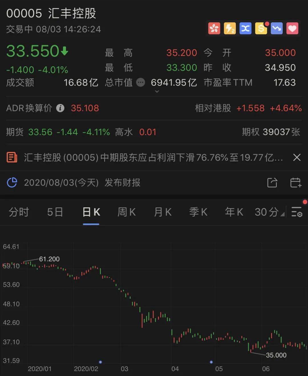 业绩公布后,汇丰控股股价在香港快速跳水,盘中一度跌近5%。截至发稿,该公司股价已较年初下跌45%,市值蒸发5600亿港元。