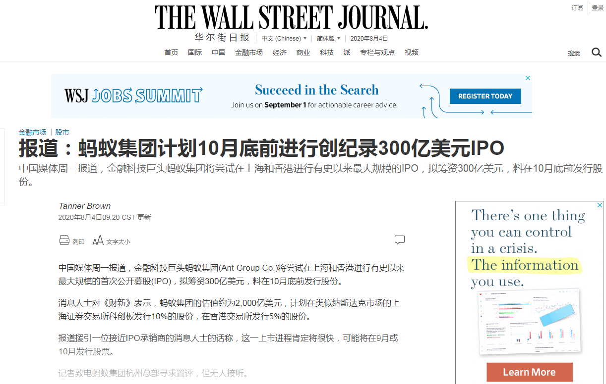 另外,华尔街日报中文网引述内地媒体报道,蚂蚁集团计划10月底前进行IPO。