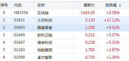 港股区块纯概念股全线走强,截至发稿,火币科技(01611)涨17.12%,报5.13港元;雄岸科技(01647)涨5.31%,报0.238港元;欧科云链(01499)涨5.37%,报0.216港元。