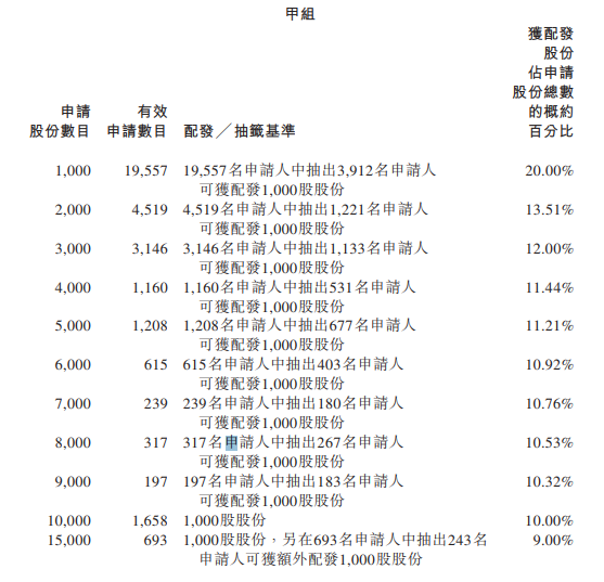 由于香港公开发售的超额认购超过15倍但少于50倍,合共3333.4万股发售股份已由国际发售重新分配至香港公开发售。于该等重新分配后,香港公开发售项下可供认购的发售股份最终数目为5000.2万股发售股份,占根据全球发售初步可供认购发售股份总数的约30%(于任何超额配股权获行使前)。