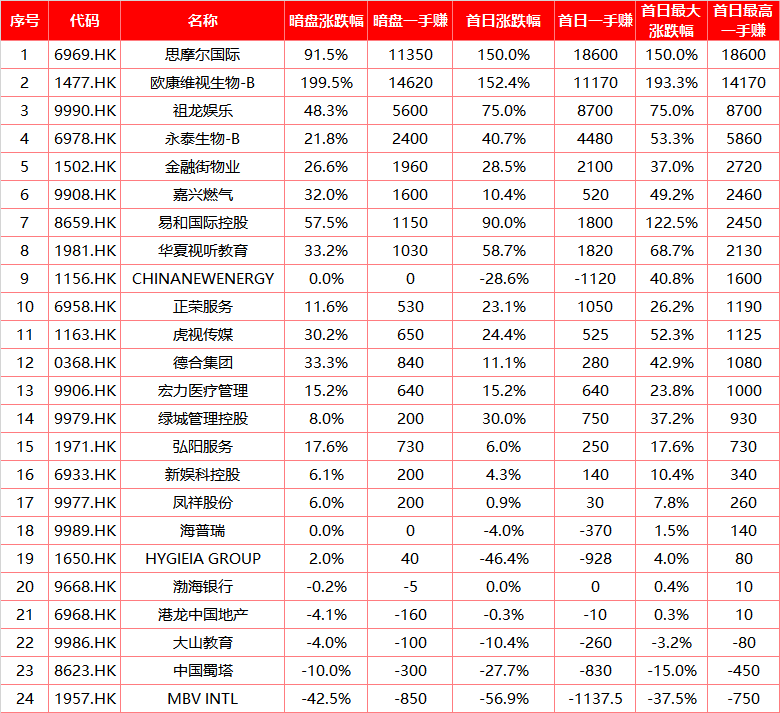 如果按照上市首日最大涨跌幅计算,一手赚超过1000港元的新股有13家,占比达54.2%;一手赚超过2130港元的有8家。