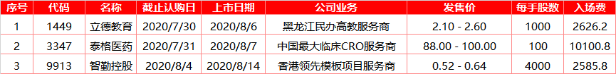 截至目前,暂定在8月上市的新股仅有3只,分别是来自黑龙江的民办高等教育服务商立德教育、继药明康德、康龙化成后第三只A+H形式上市的CRO服务商泰格医药,以及香港从事模板项目服务等业务的建筑商智勤控股。
