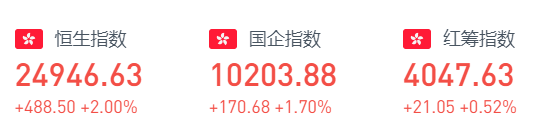 周二,恒生指数开盘涨0.84%,早盘维持横盘震荡。午后在蓝筹地产股和保险股的推动下,恒指直线拉升逾500点,尾盘继续震荡上扬。截至收盘,恒生指数涨488.5点或2%,报24946.63点,全日成交额达1459.78亿。国企指数涨1.7%,报10203.88点,红筹指数涨0.52%,报4047.63点。