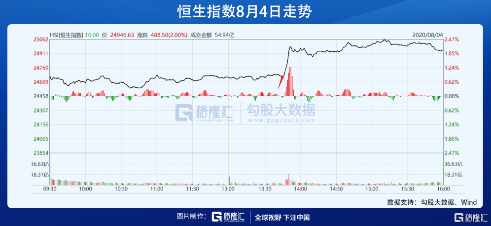 今天下午1点45的时候,港股开始直线拉升,推动力主要来自香港本土股票。发生了啥,老实讲,我没看到,倒是负面消息看到不少,比如TIKTOK。另外一种说法是,香港的新增确诊大大下降了,今天只有80例,是7月21日来首次重回两位数。但这个说法我觉得比较扯,毕竟这个数字一大早就看到了,犯不着等到下午才动。