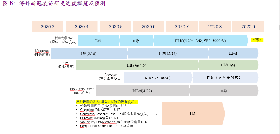 7 月 27 日,Moderna 宣布该公司开发的针对新冠病毒的 mRNA 疫苗(mRNA-1273)3 期研究已开始向参与者给药。同天,辉瑞与 BioNTech 宣布,他们将推进代号为BNT162b2 的候选疫苗进入第 II/III 期研究,公司表示他们最早将于 10 月份向监管机构递交新冠疫苗审查,此外疫苗的生产设备已经到位,2020 年底供应量可达 1 亿剂,到 2021 年疫苗生产能力可达 13 亿剂。