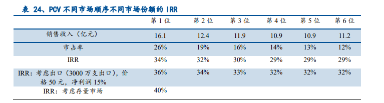 根据太平洋证券的研究,在疫苗市场上,根据PCV 渗透率30%,价格500元,4针,新生儿1500万,整体市场新增容量为90亿元的假设。市场份额按照进入顺序来划分,6家共存的情况下的各家投资回报率情况如上。整体上创新型疫苗的回报率在30%以上。