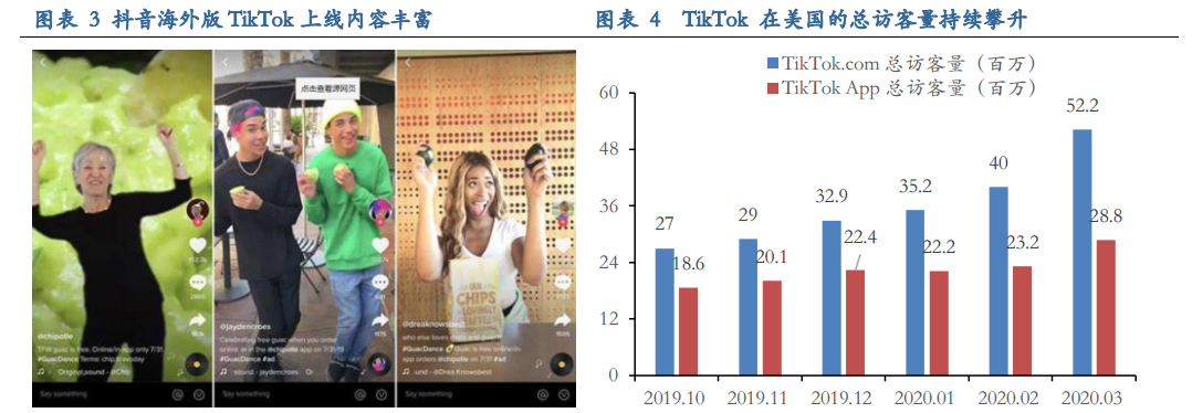 2018年海外上线以来,TikTok用户数就保持快速增长。 抖音海外版TikTok2018年在海外正式上线,以其丰富的内容、精准的营销方法和强大的客户分析能力赢得了海外用户的青睐, 使得用户形成长久的使用依赖。