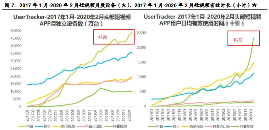 从用户数角度看, 短视频的用户规模即是流量,也带来广告营销市场的变现空间。根据统计 2020年2月抖音与快手app的月活分别为4.9亿台、3.6亿台,从用户时间维度看,短视频用户有效使用时长冠军仍为抖音。
