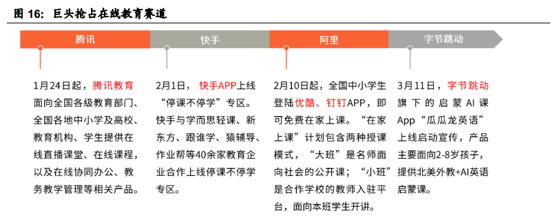 字节跳动在教育部分积极布局英语培训,2020 年3月11日公司启蒙AI课 App“瓜瓜龙英语”上线,Gogokid在线少儿英语产品坚持100%北美优质师资,面向2-8 岁儿童,提供北美外教以及 AI 英语启蒙课。