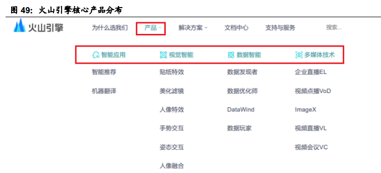 火山引擎现阶段致力于,为企业客户提供的服务,即智能应用、视觉智能、 数据智能、多媒体技术。