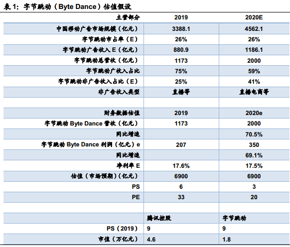 若对比腾讯控股2019 年PS(市销率)为9倍,字节跳动2020年若实现其此前预期的2000亿元收入,其合理市值约为1.8万亿元(约2600亿美元)。